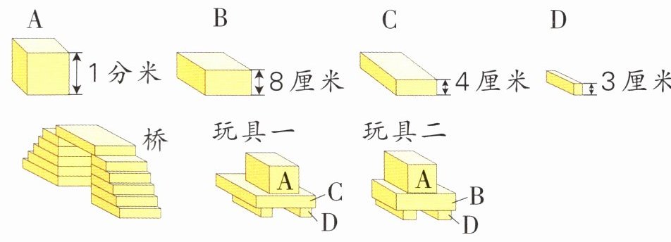 4. 王芳用长方体C拼成了一座桥,孙丽用不同的长方体拼成了2个玩具,哪个玩具能从桥下通过?