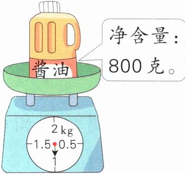 解析:“一整瓶酱油放在盘秤上”指的是瓶子+全部的酱油,重1千克。“净含量:800克。”指的是全部的酱油重800克,那么一半的酱油就是400克,瓶子就重1000-800=200(克)。