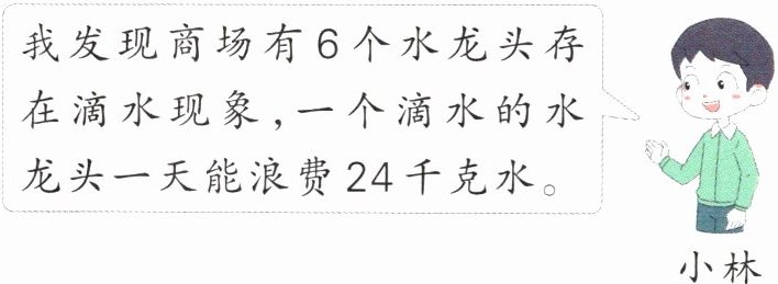 6. 学校开展“保护水环境·珍惜水资源”主题研学活动。小林调研了某商场,这些滴水的水龙头一周能浪费多少水?(一周按7天算)