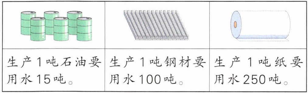 5. 我们的生产生活离不开水。生产2吨石油和2吨钢材一共要用水多少吨?
