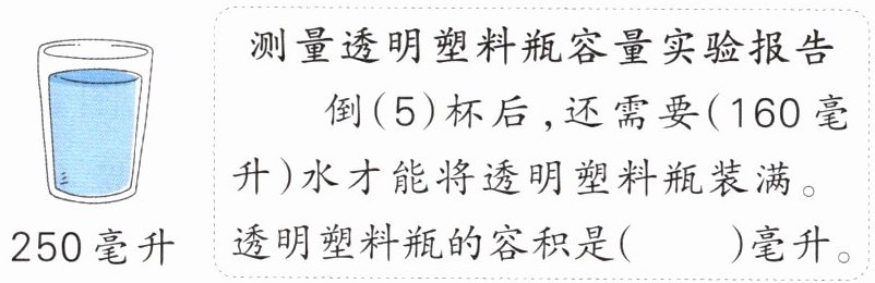 3. 小南用下图水杯装满水,多次向透明塑料瓶中倾倒并记录实验数据,请你协助他写出计算过程并填写实验报告。