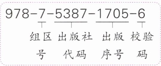 2. 国际标准书号,简称ISBN,由13位数字组成,中间以“-”分割为5段,右图是每组数字的含义。“978-7-107-36924-7”是人民教育出版社出版的小学数学三年级上册课本的ISBN。书号中“107”表示(