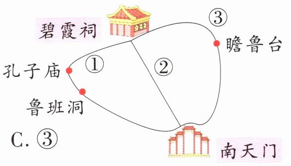 (2)[新情境·人文景观]泰山,被誉为“五岳独尊”,有多个秀美景点。右面是小明查到的从南天门到碧霞祠的游览路线,最近的路线是(