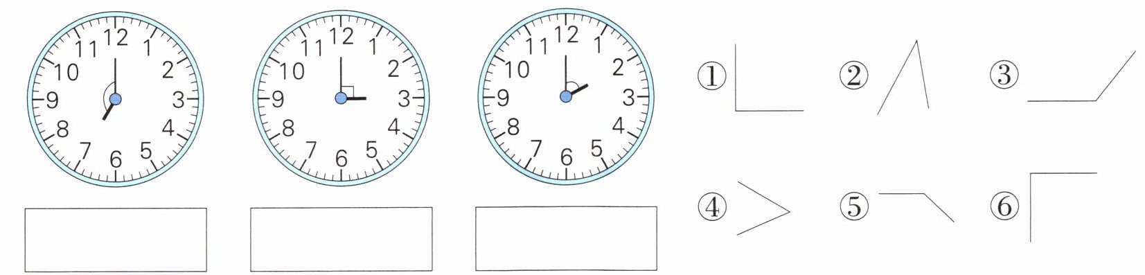 1. 如图,时针和分针形成了不同的夹角,下面哪些角分别与它们是一类的?填一填。