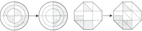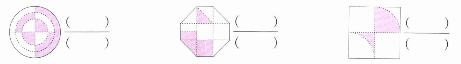 第1个图形涂色部分可以拼成一个半圆,占整个圆的一半或$\frac{2}{4}$;第2个图形可以将所有的小正方形平均分成2份,整个图形被平均分成了14份,涂色部分占其中的5份,也就是$\frac{5}{14}$;第3个图形可以平移涂色部分,拼成一个小正方形,占整个大正方形的$\frac{1}{4}$。