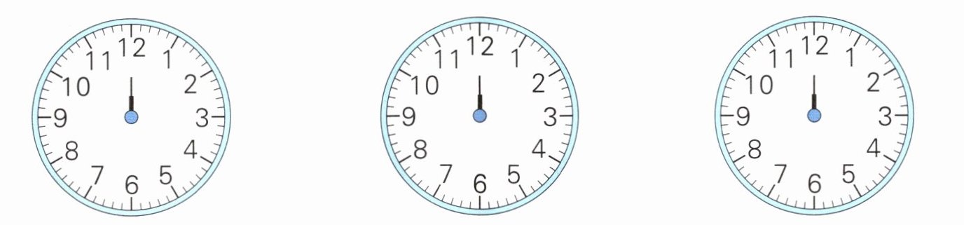 2. 现在是12:00,请按要求在钟面上依次画出时针的位置。