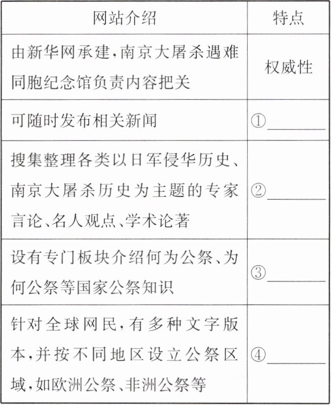 (1)请根据以下关于国家公祭网站的介绍,概括其特点并将表格填写完整。(4分)