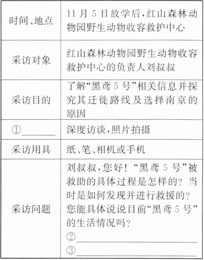 (3)①采访方式 ②示例:“黑鸢5号”选择南京作为越冬地的原因是什么?③示例:“黑鸢5号”的迁徙路线是如何确定的?