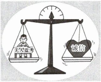 (2)漫画内容示例:漫画中有一杆天平,一边画着一个考生,考桌上写着“无人监考”,另一边画着一个心上面写着“诚信”,天平保持平衡。(2 分)漫画含义示例:无人监考的意义在于培养学生的道德自律(或:自我约束)意识,加强对诚实守信的深刻理解,分数与诚信同等重要,诚实守信从诚信考试开始。(1 分)