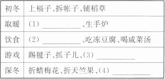 6. 请梳理本文中“冬天”的相关生活场景,完成下面的表格。(2分)