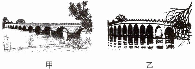 7. 甲。(1分)甲图中石拱为半圆形,与材料一中"由11个半圆形的石拱组成"一致;甲图中桥面接近直线,与材料一中"桥面平坦,几乎与河面平行"一致。(每点1分)