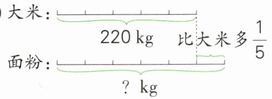 (1)大米:——— 220 kg 比大米多$\frac{1}{5}$ 面粉:——— ?kg