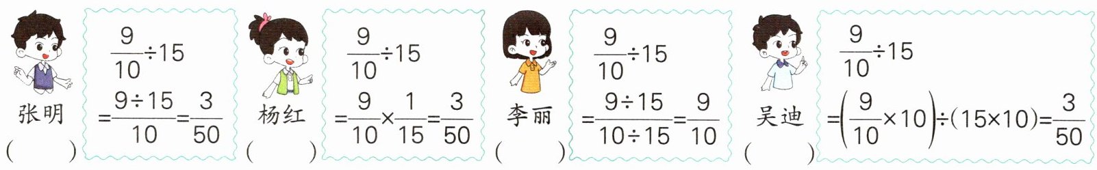 6. 在学习“分数除以整数”时,四名同学计算“$\frac{9}{10}÷ 15$”分别用了不同的方法(如下)。