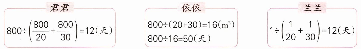 3. [新趋势·思维探究]公交公司新建一个占地$800m^2$的5G智慧停车场,招标时,A公司计划20天完成,B公司计划30天完成。两公司合作,预计多少天完成? 下面是3位同学的不同解法。