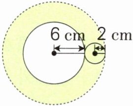 4. 如图,大圆外小圆的半径是2 cm。小圆沿着大圆滚动一周,小圆的圆心走过的路程是多少厘米?小圆滚过的面(即图中的涂色部分)的面积是多少平方厘米?