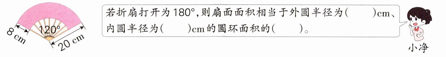 5.[新情境·传统文化]“数摺(zhé)聚清风,一捻生秋意。”描述的是我国传统折扇。一把折扇打开时的最大角度是${120}^{\circ }$,这把折扇的扇面面积是多少平方厘米?先将小净的思路补充完整,再类比求解。(得数保留整数)