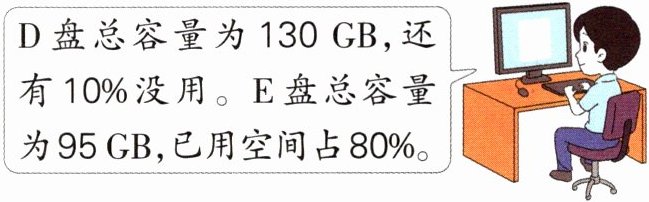 (1)D盘:$130× 10\%=13$(GB)E盘:$95× (1-80\%)=19$(GB)$13<15<19$答:李老师应该将文件保存在E盘。