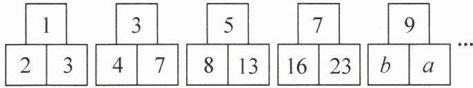 41 提示:由题图可知,第n个图形中最上面的小正方形中的数字是$2n - 1$,左下角的小正方形中的数字是$2^n$,右下角的小正方形中的数字是$2n - 1 + 2^n$.当$2n - 1 = 9$时,解得$n = 5$,所以$b = 2^5 = 32$,则$a = 9 + 32 = 41$.