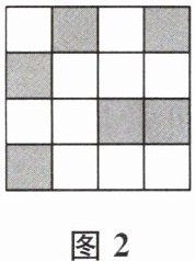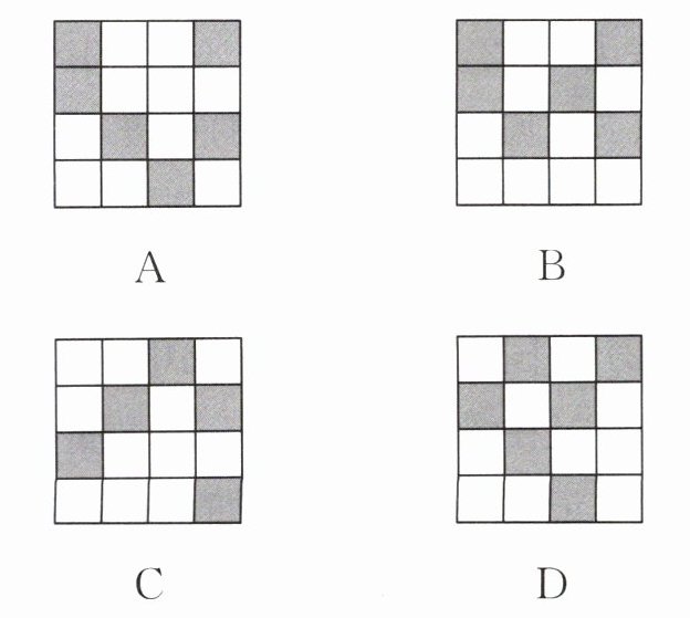 12. 二维码是用某种特定的、黑白相间的几何图形按一定规律分布在平面上的、记录数据符号信息的条码(如图1).某校利用二维码建立了一个身份识别系统,图2是某个学生的身份识别图案,其中第一行和第二行可分别转换为该学生的班级序号和学号.黑色小正方形表示1,白色小正方形表示0,将每一行数字从左到右依次记为a,b,c,d,则$a×2^{3}+b×2^{2}+c×2^{1}+d$为该行所表示的数.例如:图2中第一行数字从左到右依次为0,1,0,1,计算得$0×2^{3}+1×2^{2}+0×2^{1}+1= 5$,表示该生为(5)班学生.请判断下列选项中表示(9)班学号为10的学生的身份识别图案是 (