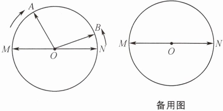 11. 小聪和小明制作了一个模拟钟面.如图,点O为模拟钟面的圆心,点M,O,N在一条直线上,指针OA,OB分别从OM,ON同时出发绕点O转动,OA顺时针转动,OB逆时针转动,OA转动速度为$15^{\circ }/s$,OB转动速度为$5^{\circ }/s$,设转动的时间为t s(t>0),请你试着解决下列问题: