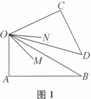 11. (南京市秦淮区期末)一副三角板AOB与COD按如图所示的方式摆放,且$∠A= ∠C= 90^{\circ }$,$∠AOB= 60^{\circ }$,$∠COD= 45^{\circ }$,ON平分$∠COB$,OM平分$∠AOD$.若三角板COD绕点O顺时针旋转(从图1到图2),设图1、图2中$∠NOM$的度数分别为α,β,则$α+β= $______°.