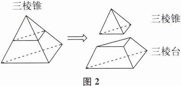 图 1 是小茗同学在课本上看到的一个有趣的几何体.经过查阅资料,得知该几何体的名称叫作三棱台.如图 2,所有的棱台都可以看作是某个棱锥被平行于底面的平面截去一个小的棱锥后得到的几何体.