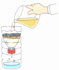 。将剪下部分倒扣在瓶身中,塞入脱脂棉、小石块等,制成一个简易过滤器。3. 把固体和液体的混合物缓慢倒入制作好的过滤器中,我们会发现脱脂棉上留下了大量的
