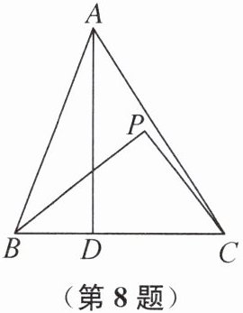 8. 如图,在△ABC 中,AD⊥BC,垂足为 D,AD= BC,P 为直线 BC 上方的一个动点,△PBC 的面积等于△ABC 面积的$ \frac{1}{2} $,则当 PB+PC 的值最小时,∠PBC 的度数为______.