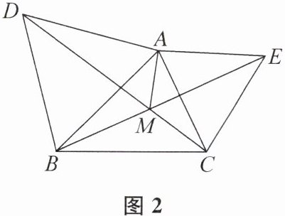 (2)如图 2,在(1)的条件下,设 BE,DC 交于 M,连接 AM,求$ \frac{MD+ME}{MB+MC+2MA} $的值.