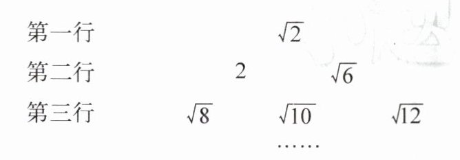 3. (2024·德阳市中考)将一组数$\sqrt{2},2,\sqrt{6},\sqrt{8},\sqrt{10},\sqrt{12},…,\sqrt{2n},…$按以下方式进行排列,则第八行左起第1个数是(