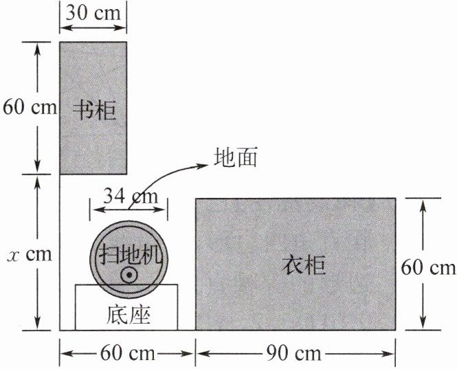 6. 如图,小红家购置了一台圆形自动扫地机,放置在屋子角落(书柜、衣柜与地面均无缝隙).在没有障碍物阻挡的前提下,扫地机能自动从底座脱离后打扫全屋地面.若这台扫地机能从角落自由进出,则图中的x至少为______.