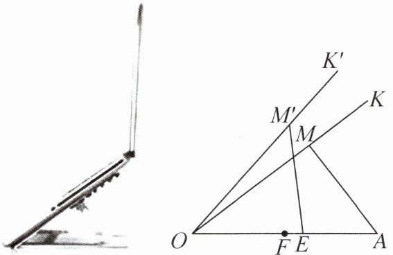 5. 如图是一种笔记本电脑支架,它有A~F共6个档位调节角度,相邻两个档位距离为2cm,已知托架OK的长度为24cm,M是支点且OM= 2MK.当支架调至点A时,AM⊥OK,当支架调至E档时,托架OK绕着点O旋转到OK',此时M'E= OE,则支点M'到OA的距离为______cm.