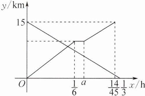 10. 甲、乙两车分别从相距15 km的沈阳科学宫和辽宁省博物馆同时匀速相向而行.甲车出发10 min后,由于交通管制,停止了2 min,再出发时速度比原来减少15 km/h,并安全到达终点.甲、乙两车距沈阳科学宫的路程$ y $(单位:km)与两车行驶时间$ x $(单位:h)的图象如图所示.