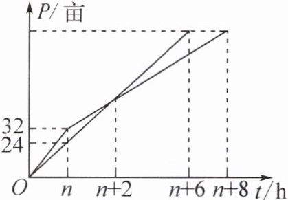 48 提示:设B户收割的土地面积P₁(亩)与收割时间t(h)之间的函数表达式为P₁ = kt(0≤t≤n + 6),A户收割的土地面积P₂(亩)与收割时间t(h)之间的函数表达式为P₂ = $\begin{cases}mt(0≤t≤n)\\at + b(n<t≤n + 8)\end{cases}$.因为P₁ = kt经过点(n,24),所以k = $\frac{24}{n}$,即P₁ = $\frac{24}{n}$t.当t = n + 6时,P₁ = $\frac{24(n + 6)}{n}$.所以P₂ = at + b经过点(n,32)与点(n + 8,$\frac{24(n + 6)}{n}$).所以$\begin{cases}an + b = 32\\a(n + 8) + b = \frac{24(n + 6)}{n}\end{cases}$,解得$\begin{cases}a = \frac{18 - n}{n}\\b = 14 + n\end{cases}$.所以P₂ = $\frac{18 - n}{n}$t + 14 + n.又当t = n + 2时,两户收割的土地相同,所以$\frac{24(n + 2)}{n}$ = $\frac{18 - n}{n}$(n + 2) + 14 + n,解得n = 2.所以P₁ = $\frac{24}{2}$×(2 + 2) = 48.