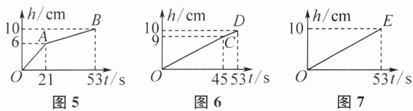 (3)由题图5、题图6和题图7可知水槽的高为10cm;由题图3和题图7可知石块的长a = 10cm;由题图4和题图6可知石块的宽b = 9cm;由题图2和题图5可知石块的高c = 6cm.所以石块的体积为abc = 540cm³.根据题图5和题图7可得$\begin{cases}21v = 6S - 540\\53v = 10S - 540\end{cases}$,解得$\begin{cases}v = 20\\S = 160\end{cases}$.所以圆柱形水槽的底面积S为160cm².