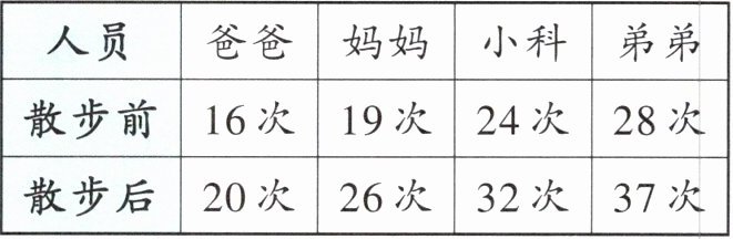 三、[新情境·生活运用]小科一家出门散步。散步前和散步30分钟后,小科一家的一分钟呼吸次数变化如右表所示。
