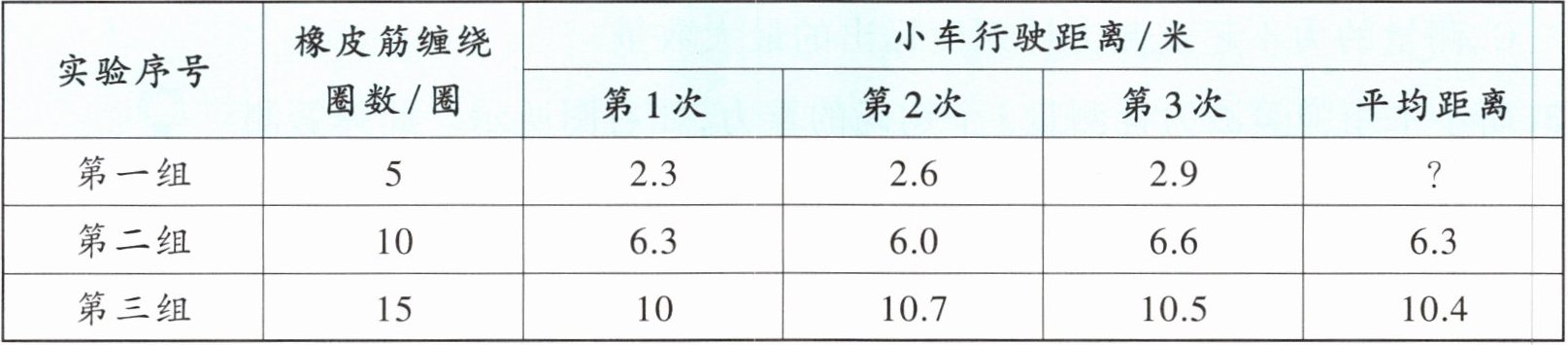 |实验序号|橡皮筋缠绕圈数/圈|小车行驶距离/米| | |平均距离|