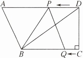 $ \frac{7}{4} $或$ \frac{8}{3} $ 提示:如图,过点P作$ PM\perp BC $于点M,则四边形PDCM为矩形.由图可知,$ CM=PD=2t $,$ PM=DC=6 $,$ CQ=t $,所以$ QM=t $,$ BQ=8-t $,$ BM=|8-2t| $.若以B,P,Q为顶点的三角形是等腰三角形,则$ 0<t<8 $,且可以分三种情况:①若$ PQ=BQ $,在$ Rt\triangle PQM $中,$ PQ^{2}=t^{2}+6^{2} $,由$ PQ^{2}=BQ^{2} $,得$ t^{2}+6^{2}=(8-t)^{2} $,解得$ t=\frac{7}{4} $.②若$ BP=BQ $,在$ Rt\triangle PMB $中,$ PB^{2}=(8-2t)^{2}+6^{2} $,由$ PB^{2}=BQ^{2} $,得$ (8-2t)^{2}+6^{2}=(8-t)^{2} $,即$ 3t^{2}-16t+36=0 $,此时$ (-16)^{2}-4×3×36<0 $,所以此方程无解,所以$ BP\neq BQ $.③若$ PB=PQ $,则$ BM=MQ $,即$ 8-2t=t $,解得$ t=\frac{8}{3} $.综上所述,当$ t=\frac{7}{4} $或$ t=\frac{8}{3} $时,以B,P,Q三点为顶点的三角形是等腰三角形.