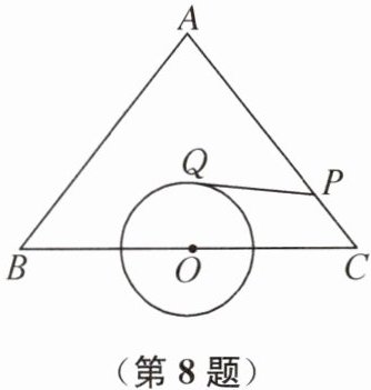 8. 如图,在等腰三角形ABC中,AB= AC= 5,BC= 6,O是边BC的中点,⊙O的半径为1,P是边AC上一动点,则由点P出发到⊙O的切线长PQ的最小值为______.
