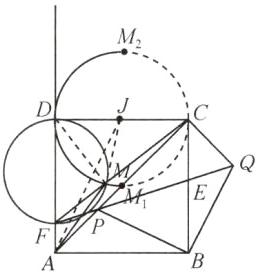 (1)如图,连接DM,取CD的中点为J.因为DF是直径,所以∠DMF=90°,所以∠DMC=180° - ∠DMF=90°,所以点M在以CD为直径的$\odot J$上运动.当点P与点A重合时,M₁是$\overset{\frown}{CD}$(直径CD下方)的中点;当点P与点C重合时,M₂是$\overset{\frown}{CD}$(直径CD上方)的中点.所以点M的运动路径是图中的$\overset{\frown}{M₁M₂}$(实线),运动的路径长为$\sqrt{2}\pi$.