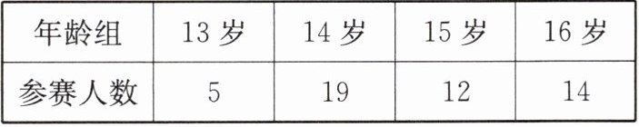 (2)王涛是15岁年龄组的选手.理由如下:因为全体参赛选手的人数为5+19+12+14=50,且50×24%=12,所以王涛是15岁年龄组的选手.