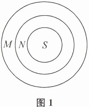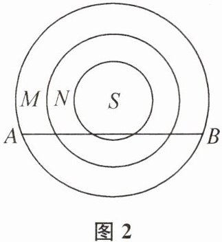 2. 如图1,一只圆形平盘被同心圆划成 M,N,S 三个区域,随机向平盘中撒一把豆子,计算落在 M,N,S 三个区域的豆子数的比.多次重复这个试验,发现落入三个区域的豆子数的比显示出一定的稳定性,总在三个区域的面积之比附近摆动.如图 2,将一根筷子放在该盘中 AB 位置,发现三个圆弧刚好将 AB 五等分.我们把豆子落入三个区域的概率分别记作 P(M),P(N),P(S),已知 $P(S)= \frac{1}{5}$,则 P(M)等于 ( )