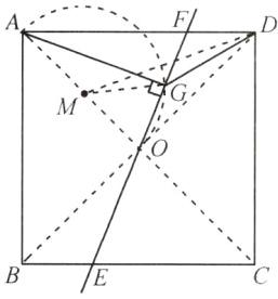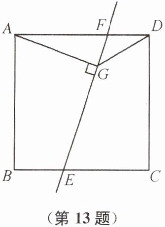 13. 如图,在正方形ABCD中,$AB= 4\sqrt{2}$,E,F分别为边BC,AD上的点,过点E,F的直线将正方形ABCD分为面积相等的两部分. 过点A作$AG\perp EF$于点G,连接DG,则线段DG长的最小值为 ______.