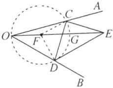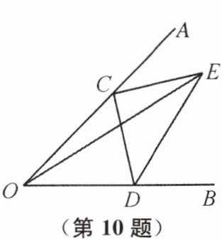 10. 如图,已知$\angle AOB= 45^{\circ}$,在边OA,OB上分别有两个动点C,D,连接CD,以CD为直角边作等腰直角三角形CDE.当CD的长度保持不变且等于2cm时,OE长的最大值是______.