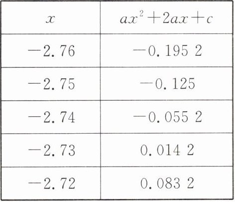$-2.7$ $0.7$ 提示:设方程$ax^2+2ax+c=0$的两个根分别为$x_1,x_2$,则$x_1+x_2=-\frac{2a}{a}=-2$.由题中表格可知,该方程其中一个根在$-2.74\sim -2.73$之间,所以关于x的方程$ax^2+2ax+c=0$的一个根约为$-2.7$,则另一个根约为$-2-(-2.7)=0.7$.