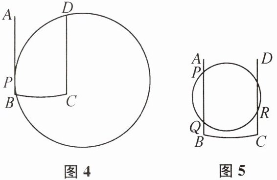 (3)设圆心为点O,过点O作$OM\perp AB$于点M,延长MO交CD于点N,连接OQ,OR,BC.易证四边形BCNM为矩形.由题意可知,$PB=5\ \text{cm}$,$BQ=1\ \text{cm}$,$CR=2\ \text{cm}$,所以$PQ=PB-BQ=4\ \text{cm}$,所以$MQ=\frac{1}{2}PQ=2\ \text{cm}$,所以$CN=BM=MQ+BQ=3\ \text{cm}$,所以$NR=CN-CR=1\ \text{cm}$.设$OM=x\ \text{cm}$,则$ON=(4-x)\ \text{cm}$.由勾股定理,得$OQ^2=OM^2+MQ^2$,$OR^2=ON^2+NR^2$,即$r^2=x^2+2^2$,$r^2=(4-x)^2+1^2$,所以$x^2+2^2=(4-x)^2+1$,解得$x=\frac{13}{8}$,所以$r=OQ=\sqrt{(\frac{13}{8})^2+2^2}=\frac{5\sqrt{17}}{8}\ \text{cm}$.
