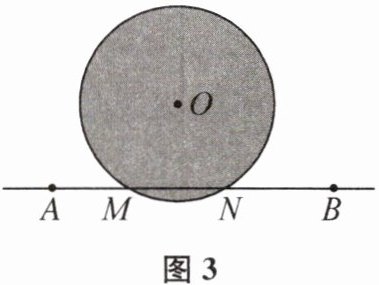 (3) 如图 3,某城市有一个圆形人工湖$\odot O$,已知直线形道路 AB 穿过人工湖,其中弦 MN 为湖中桥.现规划利用 AB 段修建四边形观湖路 ABCD,新修建的三条道路 BC,CD,DA 均穿过人工湖$\odot O$,被$\odot O$所截得的弦为湖中桥(三条弦互不相交),且湖中桥长度均与 MN 相等.在图 3 中,用直尺和圆规作出周长最短的观湖路 ABCD.(要求:保留作图痕迹,写出必要的文字说明)