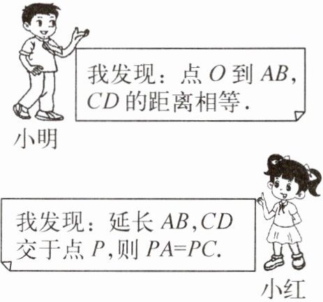如图2,过点O作OE⊥AB,OF⊥CD,垂足分别为E,F,则∠OEP=∠OFP=90°,连接OP.同小明的发现,可知OE=OF.可证Rt△OPE≌Rt△OPF(HL),所以PE=PF.所以AE+PE=CF+PF,即PA=PC.