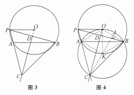 (3)2+√3 提示:如图4,取⌢AB的中点K,连接AK,BK,CK,OK,OA,OB.因为CD是PB的垂直平分线,所以点O在直线CD上,CP=CB.因为OP=OB,OC=OC,所以△POC≌△BOC,所以S△POC=S△BOC.由△PCB为等边三角形,可得∠CPB=60°=∠PCB.在圆内接四边形APBK中,∠AKB=180°-∠APB=120°.所以点A,B,C在以点K为圆心,AK长为半径的⊙K上.易证△AOK≌△BOK,所以∠AKO=∠BKO=60°.又因为OB=OK=2,所以△OBK为等边三角形,所以AK=BK=OK=2,所以点O在⊙K上.过点C作CJ⊥OB于点J,当点C,K,J依次共线时,CJ的长最大,S△BOC最大,即S△POC最大,此时OJ=BJ=1,∠OKJ=∠BKJ=30°,所以KJ=√(OK²-OJ²)=√3,所以CJ=CK+KJ=2+√3,所以S△BOC=1/2OB·CJ=2+√3.所以△POC面积的最大值为2+√3.