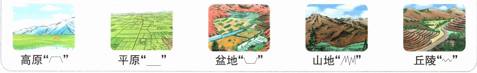 高原“∧”,平原“____”,盆地“∨”,山地“M”,丘陵“~”